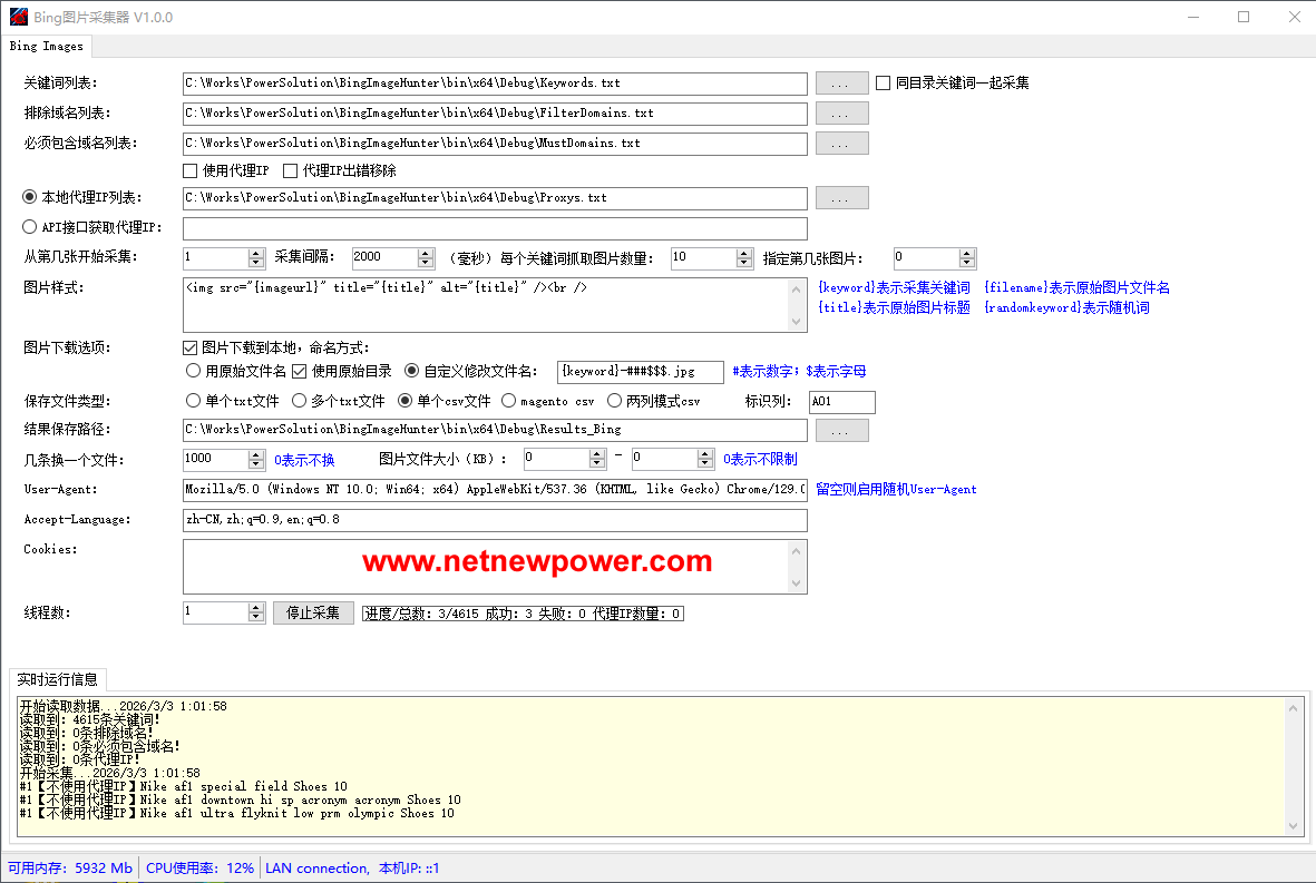 《Bing图片采集器》 是一款根据关键词从搜索引擎bing.com批量采集图片信息的工具,每个关键词采集的图片数量自定义,结果保存可以是单个TXT、多个TXT或者CSV等多种模式,软件支持多线程,支持调用代理IP采集。
